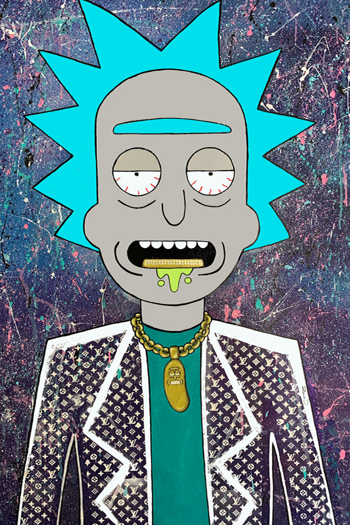 One of the first pieces completed for the PIVOT art show in 2020, this 1 of 1 was inspired by the popular cartoon Rick n Morty. It shows Rick wearing a gold ‘pickle Rick’ chain and Louis V jacket.